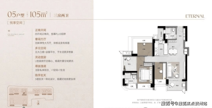 105㎡3+1房2卫,折后单价约9.5-10.8万/㎡,总价约1003-1144万