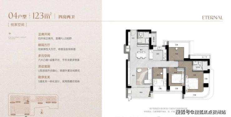 项目 123 ㎡产品,实现了 4 房空间构造,同时还保证户型南北通透同时 4 个空间为南向开启,产品