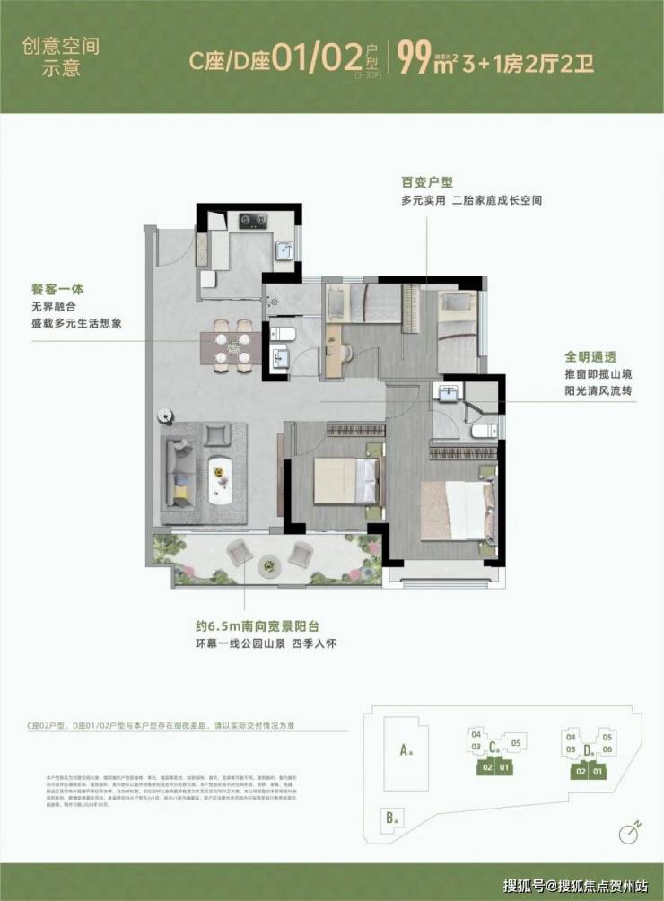 99㎡的3房2厅2卫,设计的是竖厅格局,客厅3.8米开间,LDKB一体化设计,三开间朝南,3个卧室分别做到了主卧14.12㎡/次卧11.88㎡/次卧8.64㎡(包含墙体飘窗),其中1个次卧可以做多1个房中房,客厅连接次卧出6.5米长的大阳台,U型厨房,卫生间干湿分离,得房率约80%(不含赠送),东南朝向。