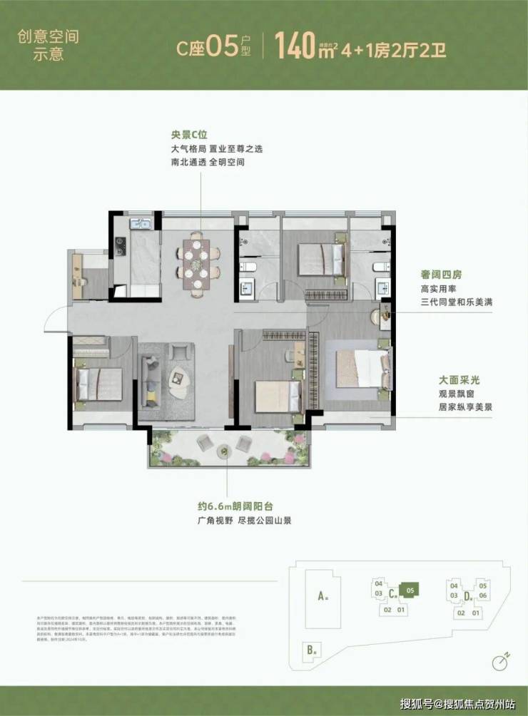 140㎡的4房2厅2卫,设计的是竖厅南北通透格局,客厅3.8米开间,LDKB一体化设计,四开间朝南,4个卧室分别做到了主卧18.55㎡/次卧10.12㎡/次卧10.08㎡/次卧9.6㎡(包含墙体飘窗),另外还有1个小储物间,客厅连接次卧出6.6米长的大阳台,L型厨房,卫生间干湿分离,得房率约78.9%(不含赠送),阳台主朝东南向。