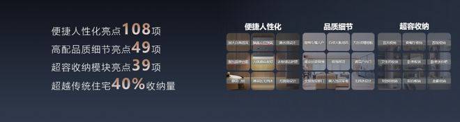 无级差地面、适老扶手等108项便捷人性化设计亮点;智能照明控制系统、品牌厨卫设备等49项高配品质细节;39项超容量收纳模块设计,比传统住宅多出40%的收纳空间,让买买买不再成为负担。
