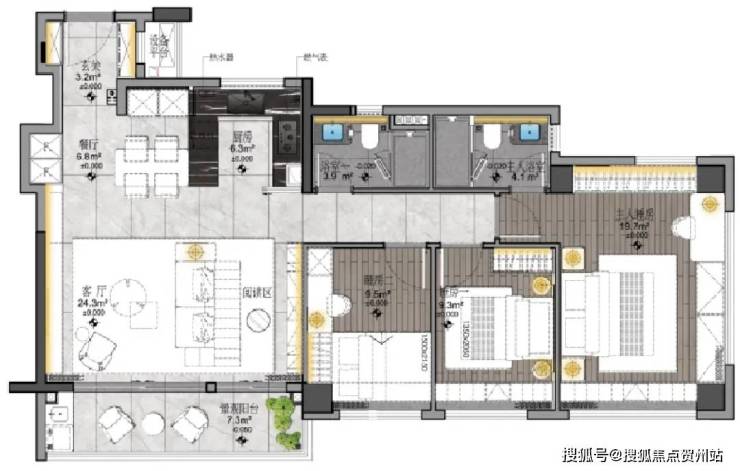 将L-living room(客厅)、D-dinning room(餐厅)、K-kitchen(厨房)和G-garden bal- cony(花园阳台)四个公共区域融为一体,生活动线更合理,空间感更强,尽显通透;