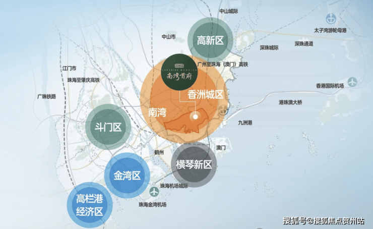 ▫南湾位居珠海地理几何中心,东面一桥之隔即为香洲老城区,南面与横琴粤澳深度合作区、十字门中央商务区一山之隔;西面规划鹤州新中心;