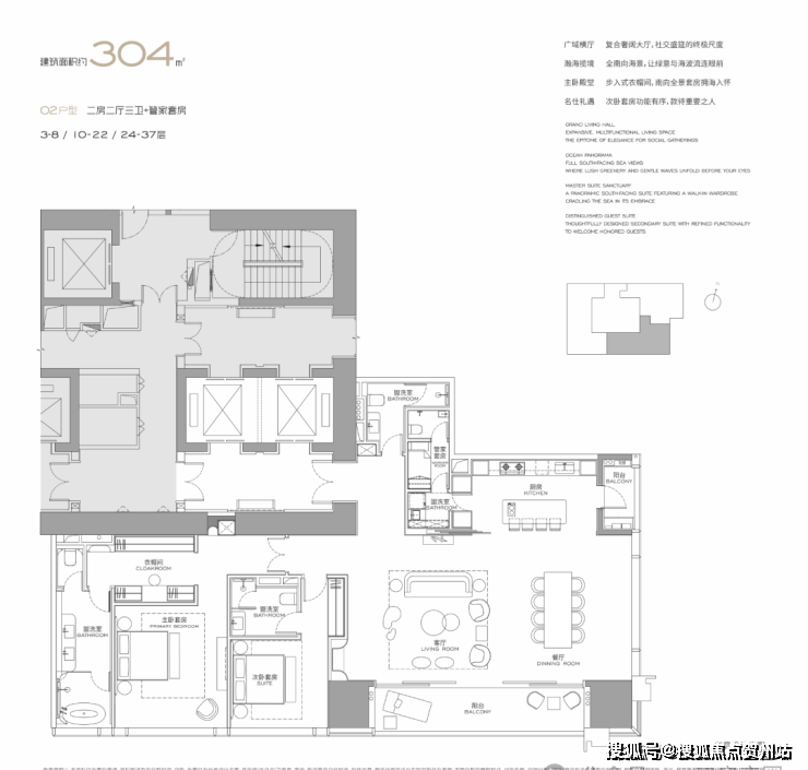 (3-57层)T3栋 四房四卫+家政套间。中西厨分区,餐客西厨一体,带多功能房。端头位置,三面采光。功能完备,房间数充足;实现了主仆双动线;会客观景视野一流。
