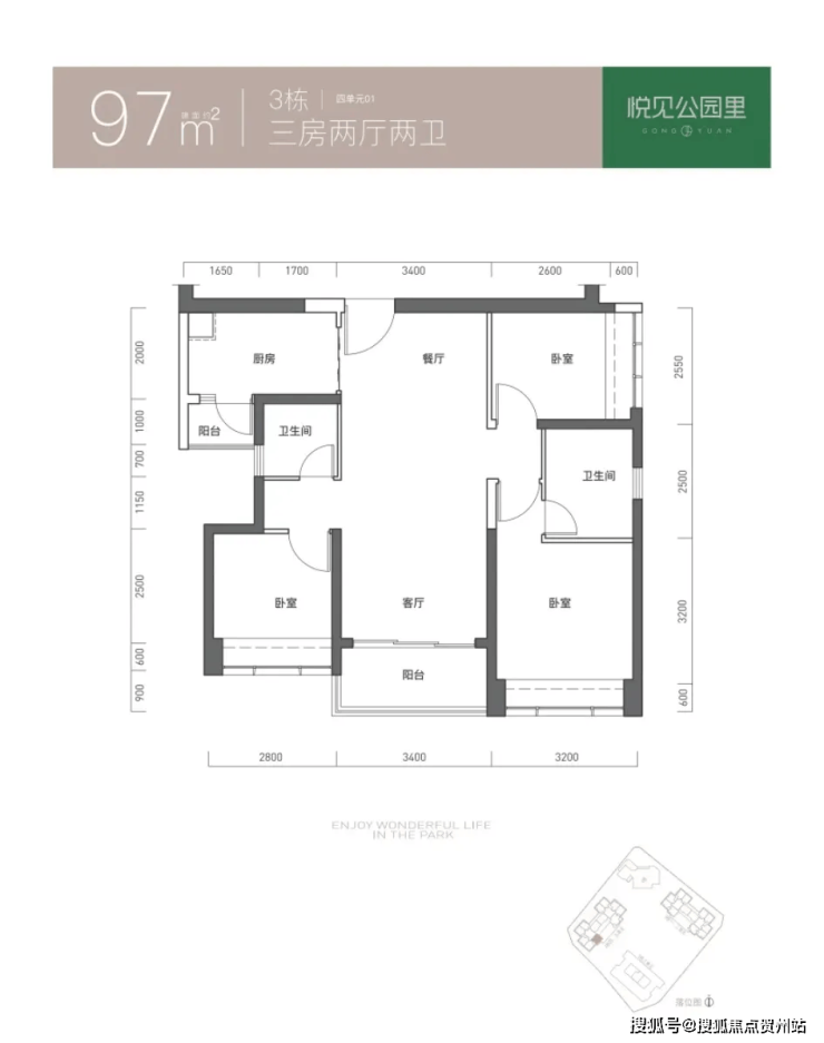 97㎡的3房2厅2卫,仅3栋4单元01户型,设计的是竖厅双龙抱珠格局,客厅3.4米开间,三开间朝南,3个卧室分别做到了主卧11.97㎡/次卧7.47㎡/次卧7.17㎡(实测面积,去掉墙体),L型厨房带1个生活阳台,公卫三段式分离,得房率73.61%(不含赠送),东南朝向。