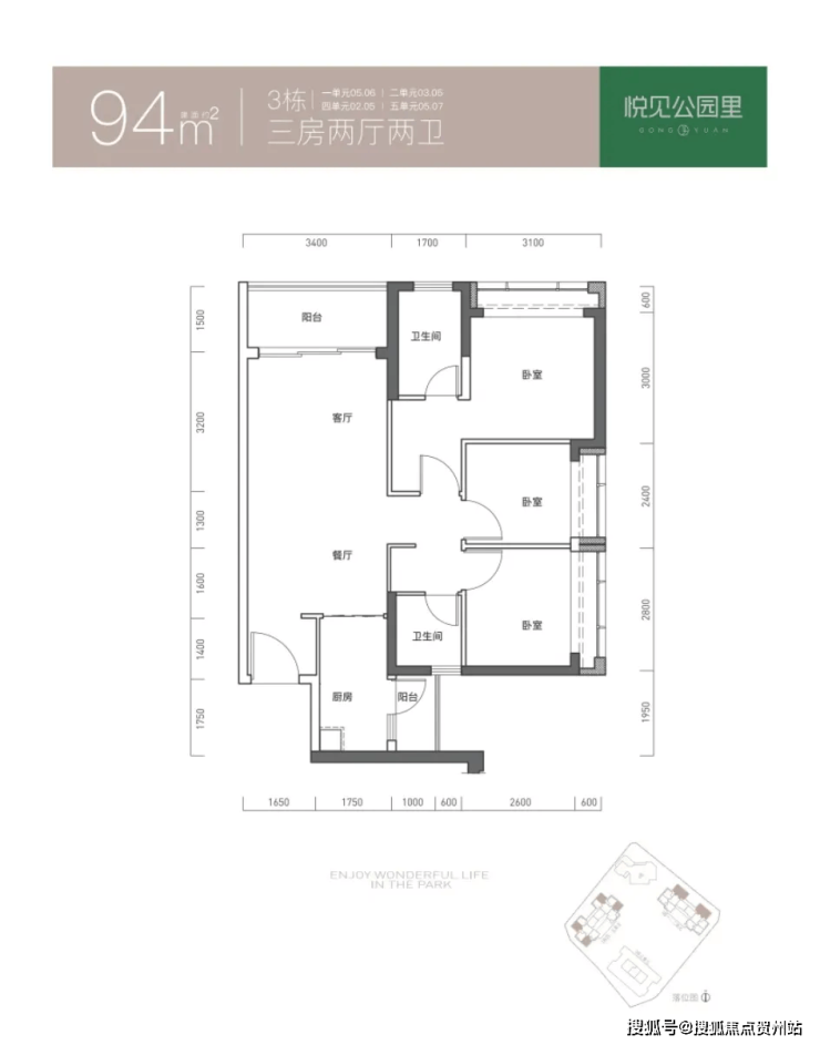 95㎡的3房2厅2卫,仅3栋1单元01户型,设计的是竖厅双龙抱珠格局,客厅3.4米开间,三开间朝南,3个卧室分别做到了主卧11.97㎡/次卧7.47㎡/次卧7.17㎡(实测面积,去掉墙体),L型厨房带1个生活阳台,公卫三段式分离,得房率73.71%(不含赠送),西南朝向。