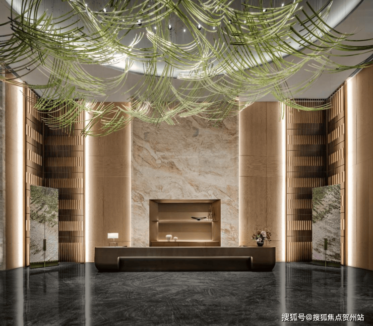 细节上,比如公区一楼大堂,项目巧妙地将水草、石材等自然元素融入其中,与深超总“十字生境”的片区生态形成呼应,从而营造出一个由外而内、层层递进的静谧艺术空间。