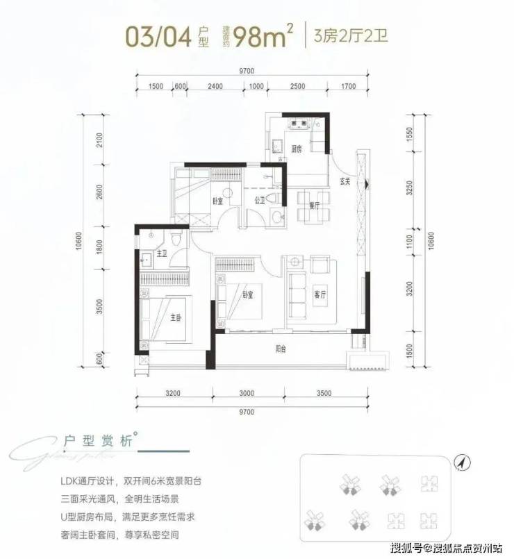 建面约98㎡是传统竖厅动静分区格局,客厅进深7.55米(不含阳台),开间3.5米,配有6.5米宽景阳台,主卧13.18㎡(不含主卫和飘窗),客厅空间变化不大,但厨房和卧室空间要好很多,居住的舒适性会比较好。