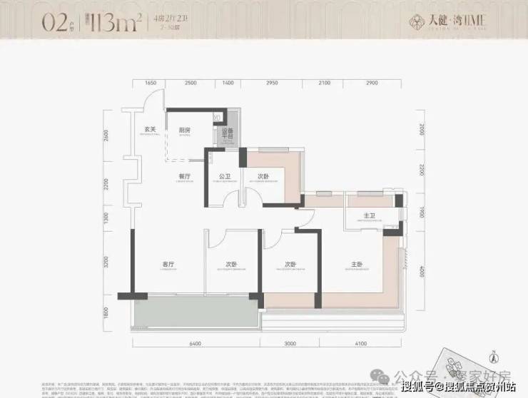 114㎡4房2卫,竖厅户型,朝北对着金众,户型结构和113完全一样,就是客厅也做了一面4.5米宽的凸窗;