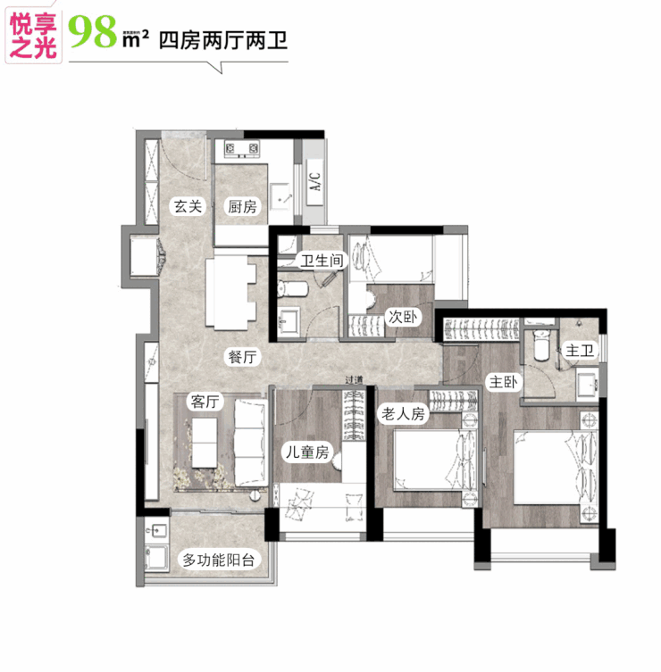 对于想要追求改善的购房者而言,建面约98㎡的四房户型足够你达成一步到位的终极目标。