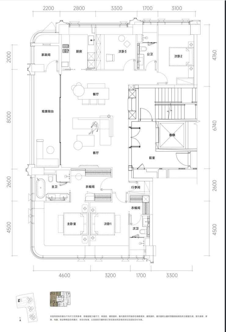 户型为四房三卫设计,功能分区做得很好。采用一户一梯专梯入户,南北通透结构,是整个南山里非常稀缺的户型。