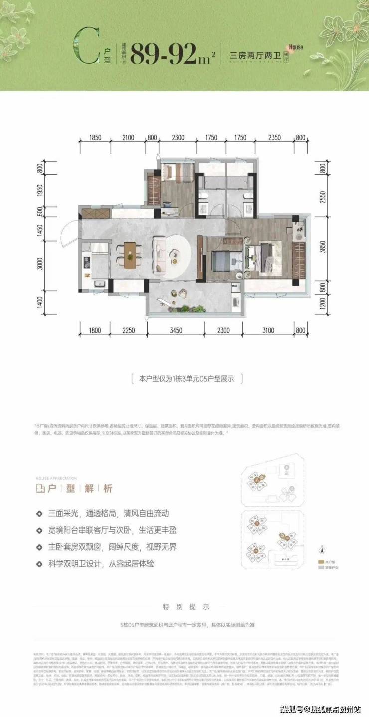 89㎡的3房2厅2卫,C户型,设计的是横厅南北通透格局,进门入户玄关,客餐厅5.7米开间,LDKB一体化设计,主卧套房双飘窗,3个卧室分别做到了主卧18.5㎡/次卧7.7㎡/次卧6.9㎡(包含墙体飘窗),客厅连接次卧出5.75米长的巨幕大阳台,U型厨房,科学双明卫,得房率约102-105%(包含赠送),阳台主朝东南向。
