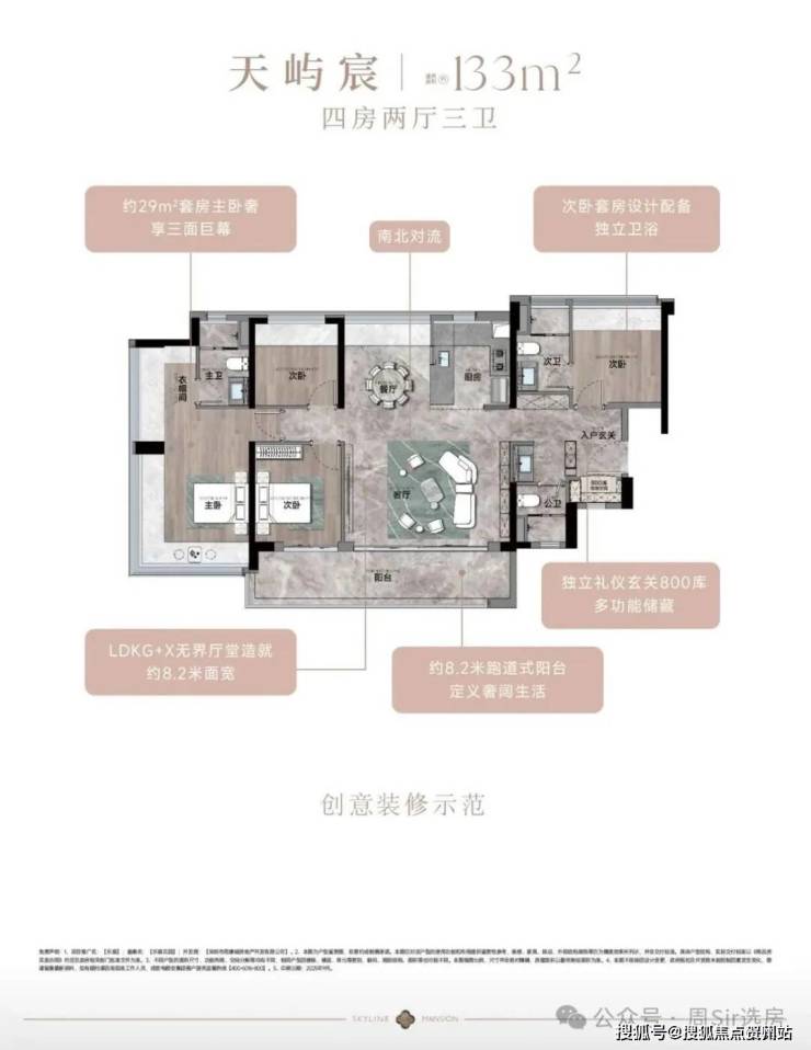 133㎡的4房2厅2卫,设计的是竖厅南北通透格局,进门入户玄关,客厅5.4米开间,餐客厅分离设计,客厅连接次卧出12.3m²的观景大阳台,L型中式+岛台灵动式厨房,公卫三段式干湿分离,得房率约78.27%(不含赠送),阳台主朝东南或西南向。靓点:超大客餐厅南北对流+8.2米长超大观景南向阳台,超大主卧+270°无柱转角飘窗。