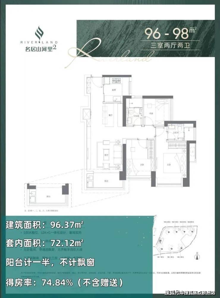 96-98㎡的3房2厅2卫(05户型),设计的是经典竖厅格局,餐客厅一体化,客厅3.5米开间,S墙设计预留冰箱位,三开间朝南,U型厨房,得房率:74.84%(不含赠送),阳台1.5米进深,东南朝向。