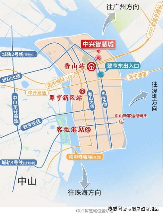 交通:距深中通道翠亨东出入口约 800 米,30 分钟达深圳前海;步行约 5 分钟到南中城际香山站(在建,接驳广州 18 号线);临近中开高速、翠亨快线,10 分钟到中山客运口岸,30 分钟到市区。