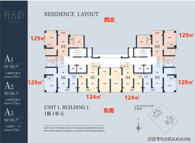 A1有两条腿,分别1-1栋01/02,主朝向是西北向,双龙抱珠格局。