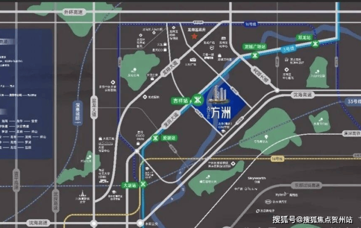 方洲无缝接驳地铁3号线吉祥站,两站换乘14号与16号线,一部短剧的时间直达岗厦北。约10分钟上水官高速、沈海高速,约15分钟上外环高速,约30分钟即达市内。