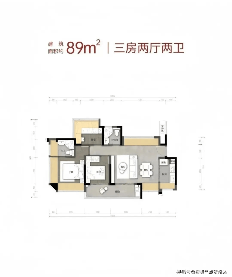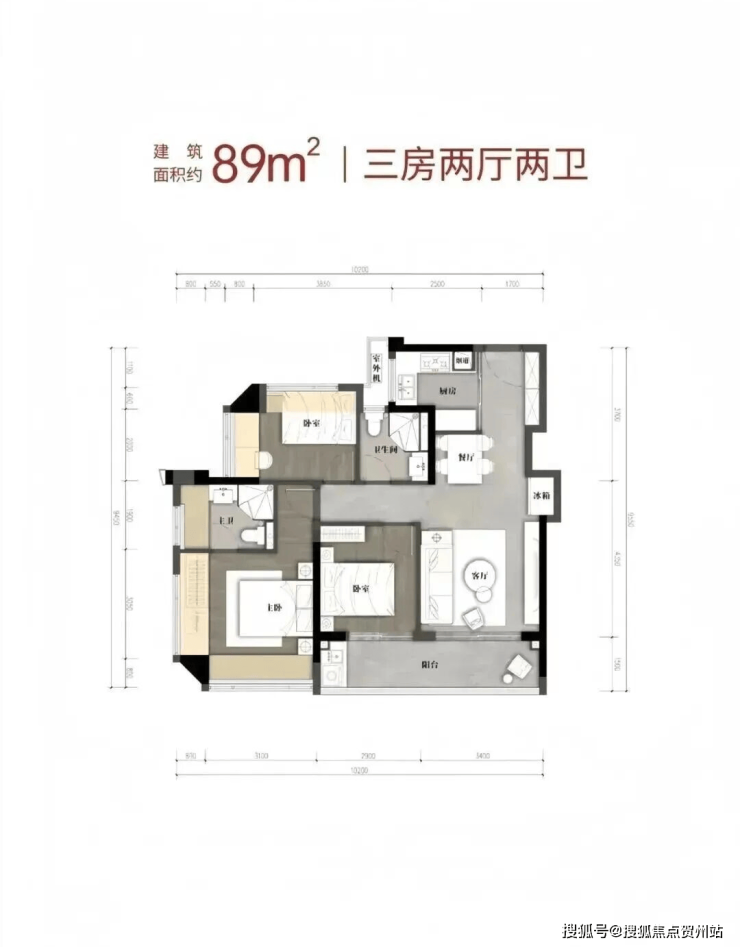 89㎡的3房2厅2卫,1栋02.03户型,经典竖厅,客厅3.4米宽,LDKB一体。S墙预留冰箱位,主卧16.28㎡/次卧9.53㎡/9.42㎡(含飘窗)。U型厨房,卫生间干湿分区。得房率79.6%(不含赠),客厅连次卧带9.45m²阳台,西南向。套内70.43m²+赠14.58m²=实用85.01m²,含赠得房率96.1%。