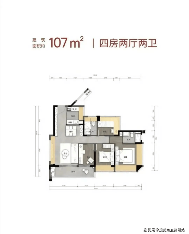 1的4房2厅2卫,经典竖厅设计,客厅4米宽,LDKB一体,预留冰箱位,动静分区。主卧17.18㎡,次卧11.2㎡、8.64㎡、7.68㎡(含飘窗)。U型厨房,卫生间干湿分离。得房率79.6%(不含赠送),客厅连10.24m²阳台,东南向。套内85.19m²+赠22.96m²=实用108.15m²,赠后得房率101.08%。