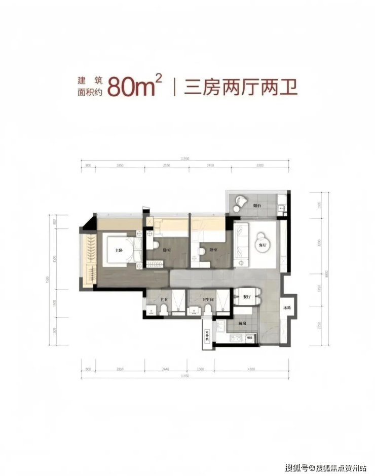 80㎡3房2厅2卫,设计为竖厅,客厅宽3.3米,LDKB布局,S墙预留冰箱位,动静分区。主卧16.38㎡,次卧8.16㎡和7.84㎡(含飘窗)。U型厨房,卫生间干湿分区。得房率79.6%(不含赠送),阳台4.95m²朝东北。套内面积63.98m²+赠送11.55m²=实用面积75.53m²,含赠送得房率94%。