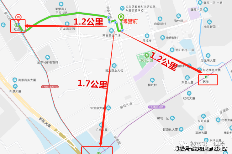 鸿荣源博誉府属于龙华红山片区,位于龙华大道和民旺路交汇处,紧邻深圳北站商务中心及红山商住片区,项目两边分别挨着公园和龙华科学院附属实验学校,仅隔龙华大道,斜对面有绿景公馆1866、莱蒙水榭春天等大型社区,与金亨利等住宅社区项目隔路相邻;东向则是民治传统的商业中心,拥有大量的居住群体及多元化的商业配套。