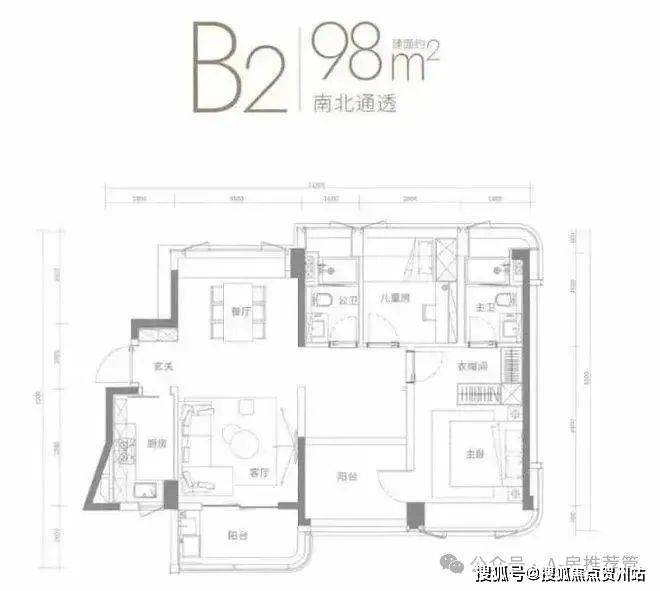 约98㎡户型,南北通透,南向采光面达到11.5米,除了承重墙部分外,都做成了阳台和飘窗,连两个卫生间都有一整面的飘窗,做到室内全明。主卧也是南北向布局,起居舒适度很好。
