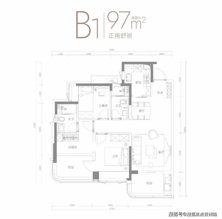 约97㎡户型,三面采光,南向采光面达到9.7米,次卧拥有L型飘窗,270°的采光面。主卧套房设计,带独立卫生间私密空间。