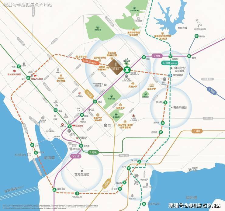 地铁15号线:起于西乡、终至前海,串联南山西丽、科技园、大铲湾片区,打造前海内环黄金圈。