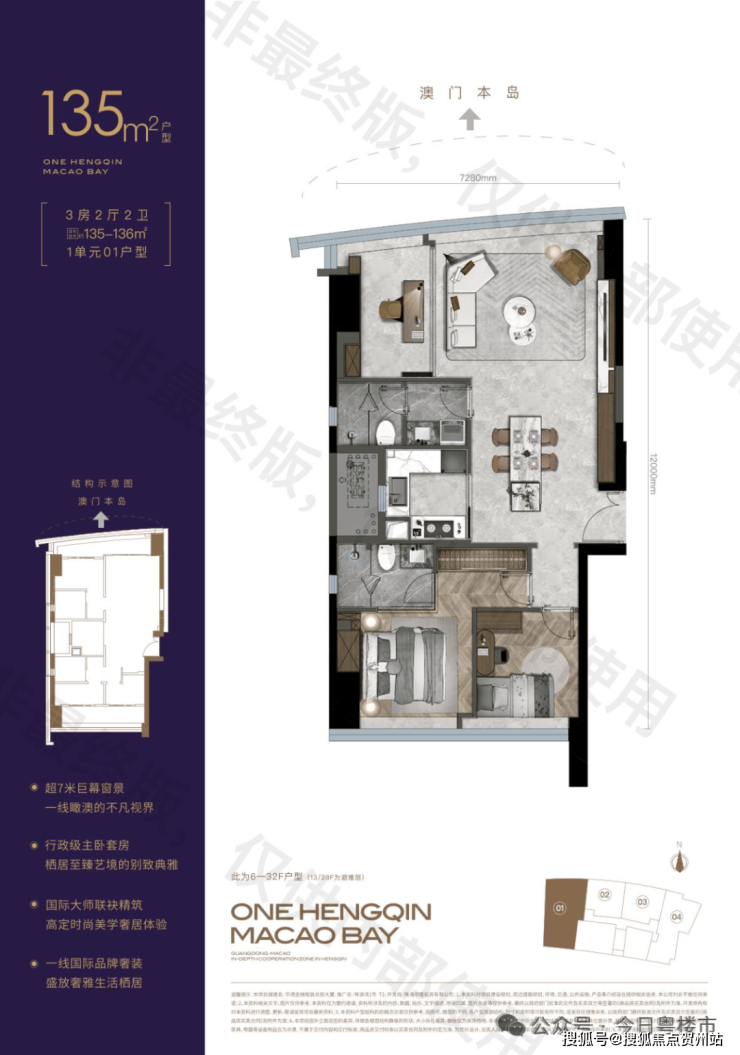 项目住宅产品定位“高端酒店式住宅“,满足高端商务型,旅居型豪宅客户群体,对标深圳湾 1 号、纽约 ONE57 公寓等世界级重磅住宅产品,产品面积从 78-135 ㎡,交付标准为奢配精装,选用国际一线品牌,如大金、博世、嘉格纳、美诺、当代、铂浪高、汉斯格雅等,革新横琴高端人居标准。