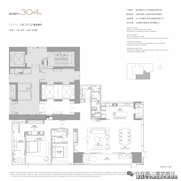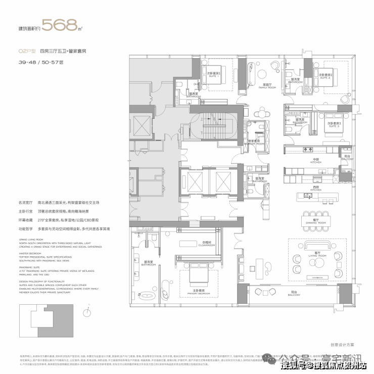 公寓主力户型为303㎡、326㎡、404㎡、572㎡等大平层,最大户型达1000㎡