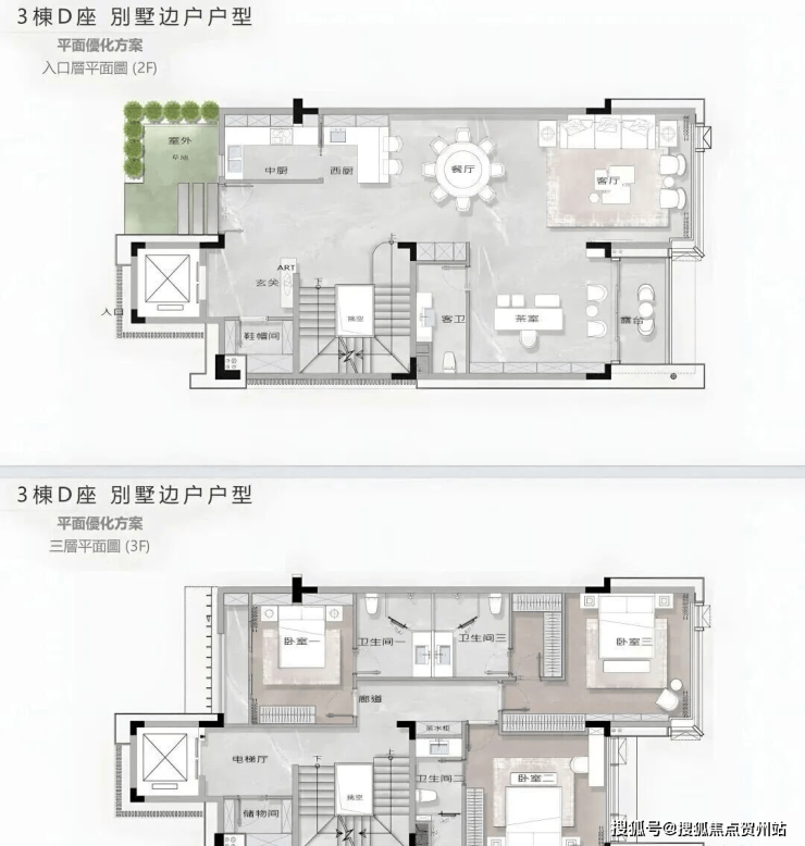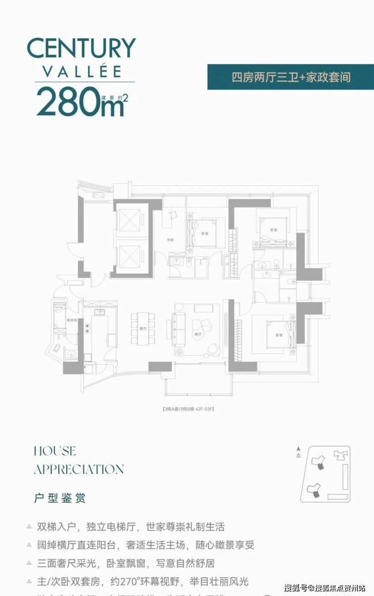 【约386㎡4+1房4卫】双梯入户,独立电梯厅,阔绰横厅直连多功能空间,三面舒适采光,主次卧双套房,270°环幕视野,还有独立家政套间,西朝向看名商高尔夫和大河沙生态长廊。