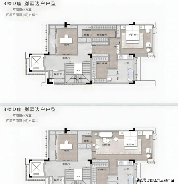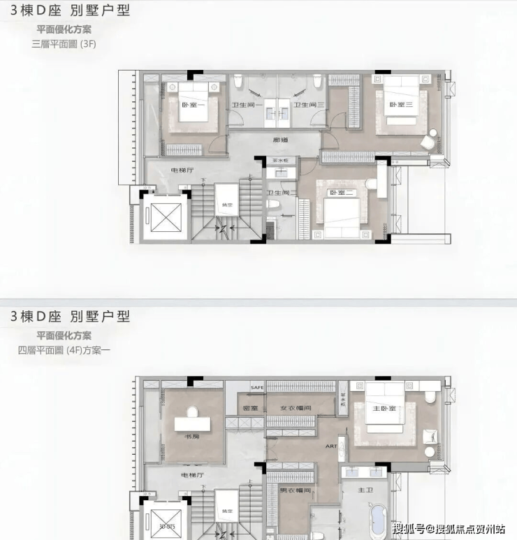 【约280㎡4+1房4卫】双梯入户,独立电梯厅,阔绰横厅直连阳台,三面舒适采光,主次卧双套房,270°环幕视野,还有独立家政套间,西南朝向看城市景观,高层可看深圳湾海景;