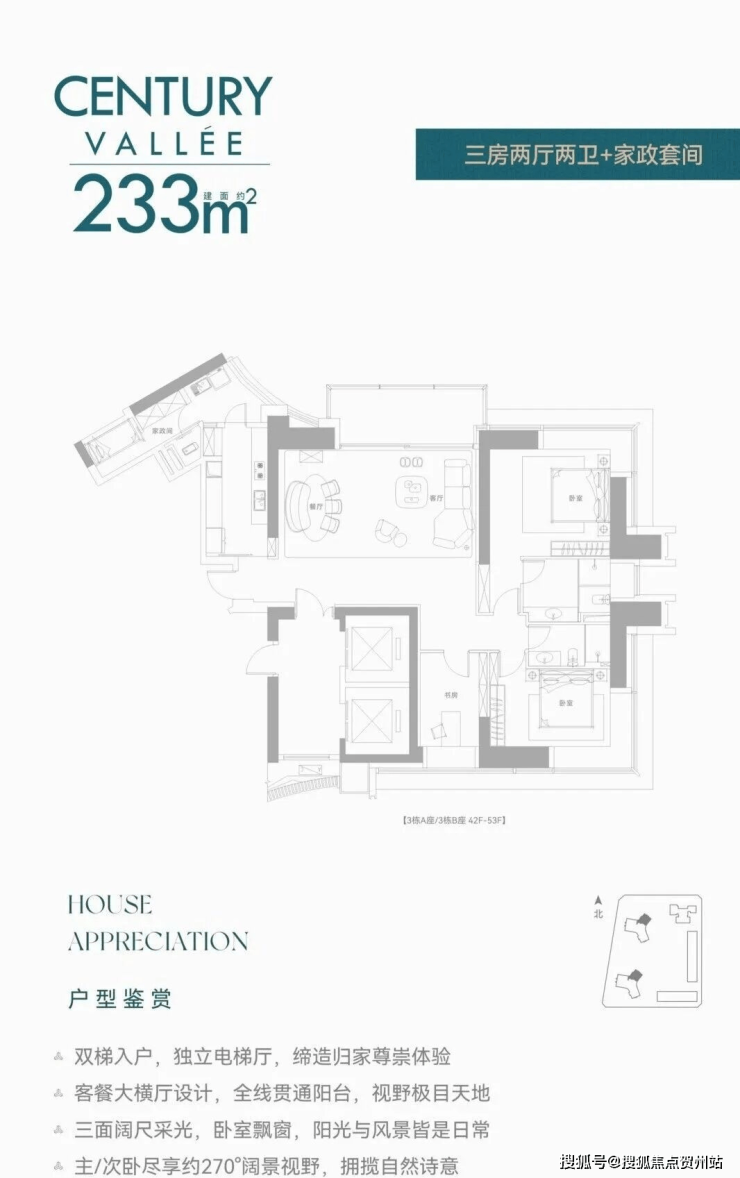 【约233㎡3+1房3卫】双梯入户,独立电梯厅,餐客大横厅贯通阳台,三面采光,主次卧尽享270°环幕视野,还有独立家政套间,西北朝向看名商和沙河高尔夫