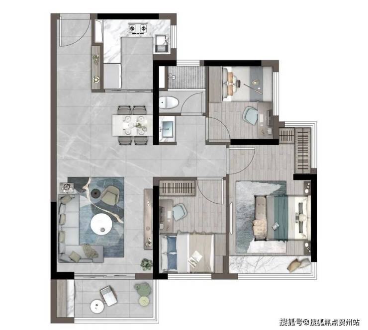 89㎡丨三房两厅两卫; LDKG一体化设计;U型厨房;约6米双面宽超大景观阳台;独立卧室带独立卫浴;主题设计儿童房