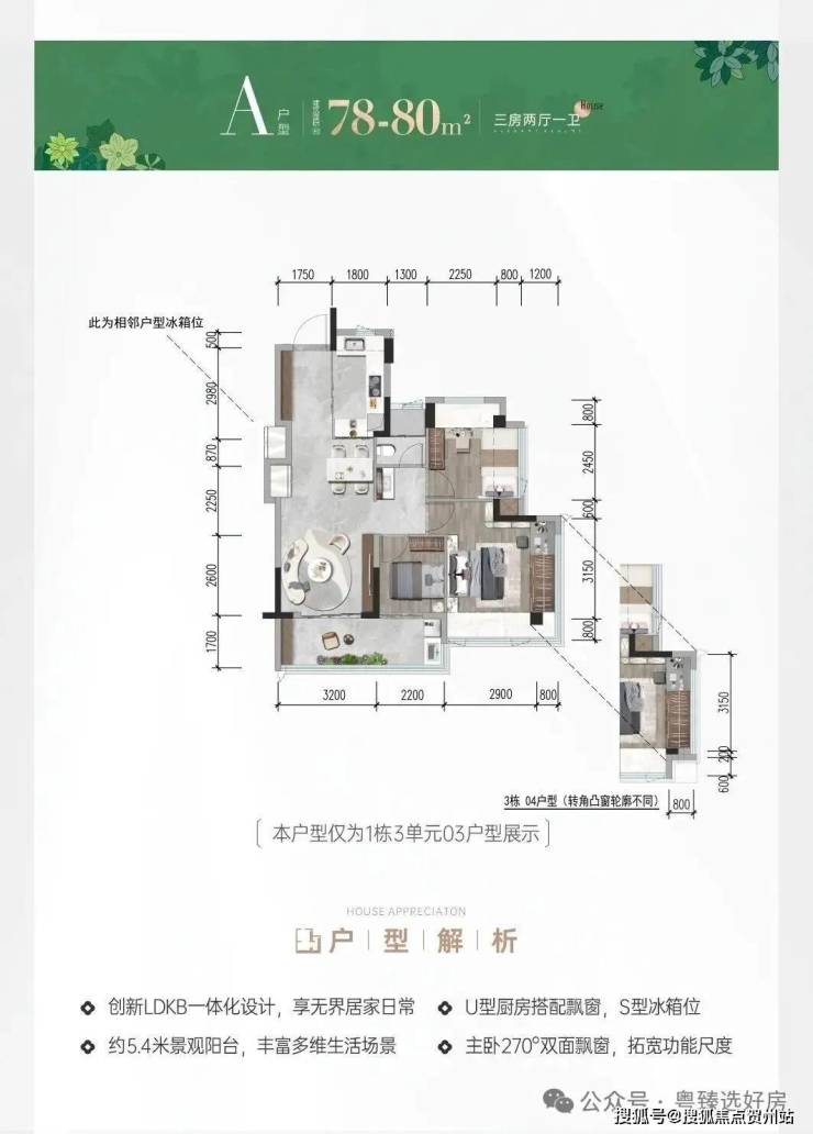 80㎡三房一卫:360-380万,约5.4m宽境阳台,三开间向阳;