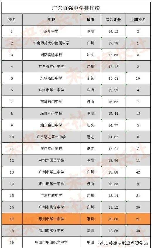 惠州一中是惠州市排名第一的中学,在2022年初刚出炉的“广东百强中学排行榜”中,惠州一中是唯一一所进入广东前20排名的中学,排名17!比名声大噪的深圳市高级中学(排名18)还靠前1位!