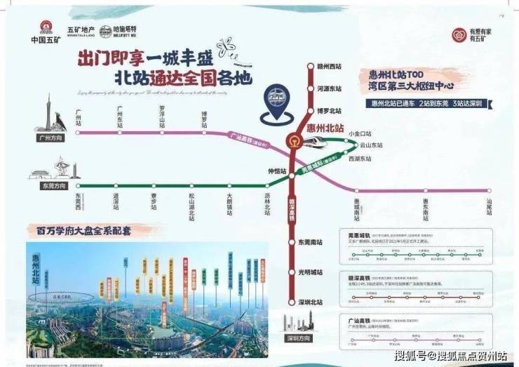 轨道交通枢纽,多维立体交通项目项目位于北站新城,距离惠州北站仅约3.8km,体育大道通车后约5分钟即达惠州北站,2021年,惠州北站-赣深高铁已开通,一站达深圳,最快约12分钟到东莞、18分钟到深圳,打通惠城贯通湖北、湖南、上海等多省市轨道大动脉。