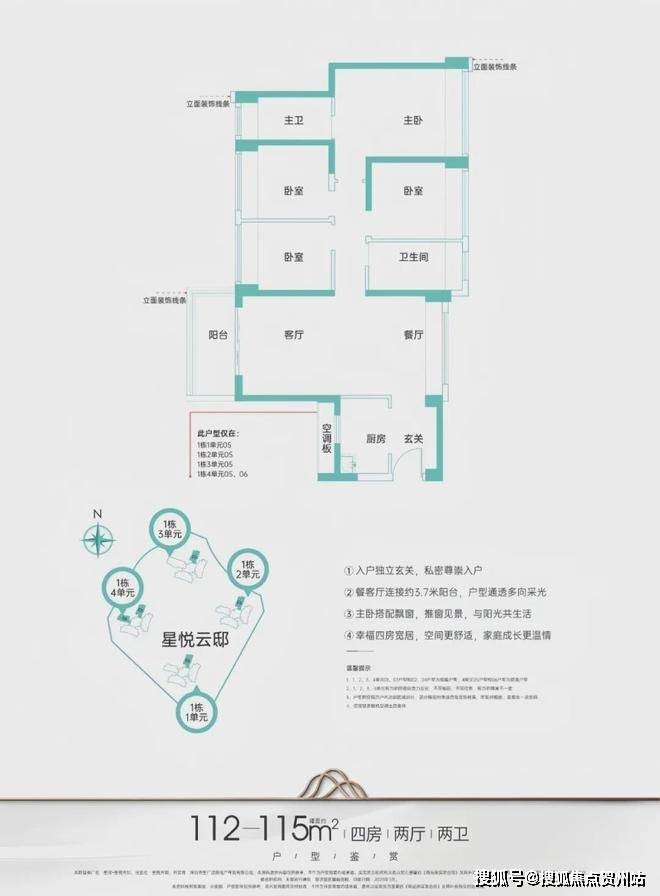 112㎡的4房2厅2卫,设计的竖厅通透格局,客厅3.7米开间,进门独立入户玄关,全屋飘窗设计,4个卧室分别做到了主卧16.2㎡/次卧10.36㎡/次卧8.91㎡/次卧8.58㎡(包含墙体飘窗),得房率:78.16%(不含赠送),阳台主朝西北或东北向。