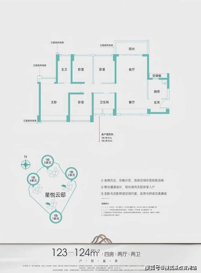 123㎡的4房2厅2卫,设计的竖厅南北通透格局,进门独立入户玄关,全屋飘窗设计,U型厨房,得房率:78.15%(不含赠送),阳台主朝东北向。