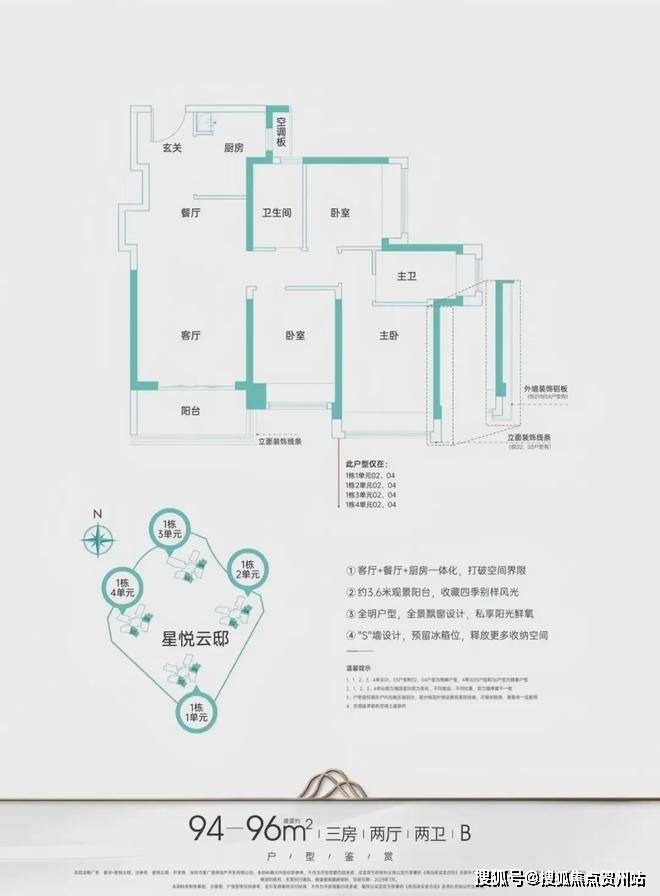 94㎡的3房2厅2卫,设计的经典竖厅格局,客厅3.6米开间,客餐厨一体化,S墙设计预留冰箱卡槽位,三开间朝南,3个卧室分别做到了主卧14.41㎡/次卧9.72㎡/次卧8.23㎡(包含墙体飘窗),U型厨房,得房率:78.15%(不含赠送),西南或东南朝向。