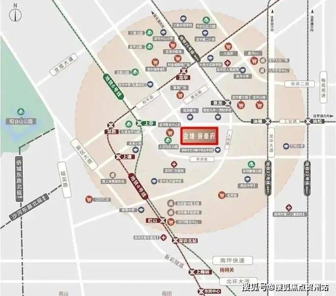 金地启曜,位于龙华区民治街道工业路与龙华人民路交汇处,项目东侧是同期在售的鸿荣源尚云花园,南侧是艺术高中民治学校,北侧是龙华商业中心城市更新单元,4号线“龙华站”距离约1公里,东南侧是龙华最大的商业中心-壹方天地购物中心。