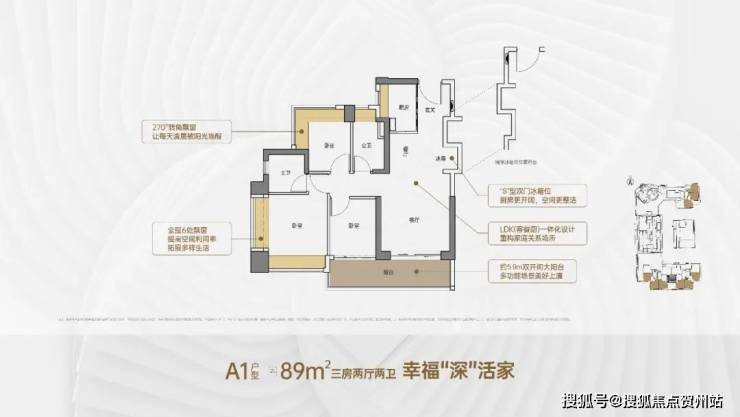 89㎡的3房2厅2卫,A2户型,设计的是竖厅格局,客厅3.5米开间,LDKB一体化,S墙设计预留冰箱卡槽位,客厅连接次卧出5.9米长的大阳台,次卧270度转角飘窗,U型厨房,卫生间干湿分离,阳台有朝西向、东向、南向。