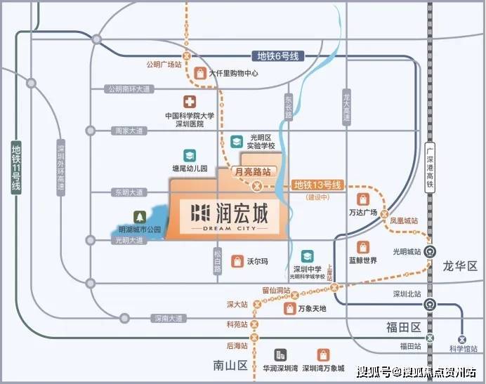华润润宏城位于光明区凤凰街道塘尾社区,光明大道和东长路交汇处的西北侧,刚好在13号线“月亮路站”附近,北部接壤东周路。整体规划了382.5万㎡的超大体量,另外配备了2所18班幼儿园,3所12班幼儿园,3所9班幼儿园,3所九年制学校,由华润置地与宏发集团联合开发。