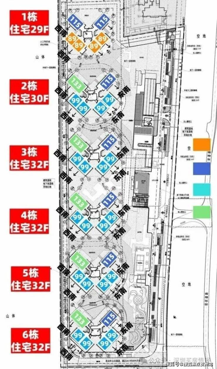 总规划1086户,全部3梯6户设计,户户朝南,地下室有3层,规划1116个车位,车位比1:1.02。