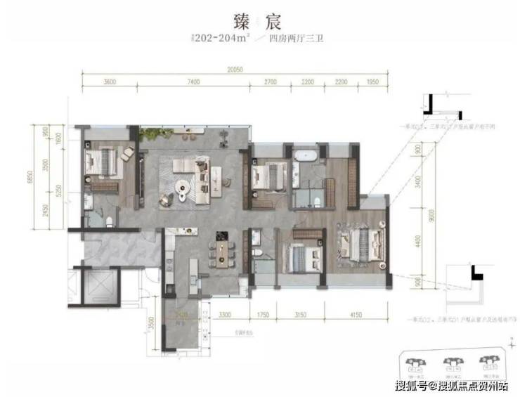 【产品户型】:建面约202-204㎡四房两厅三卫