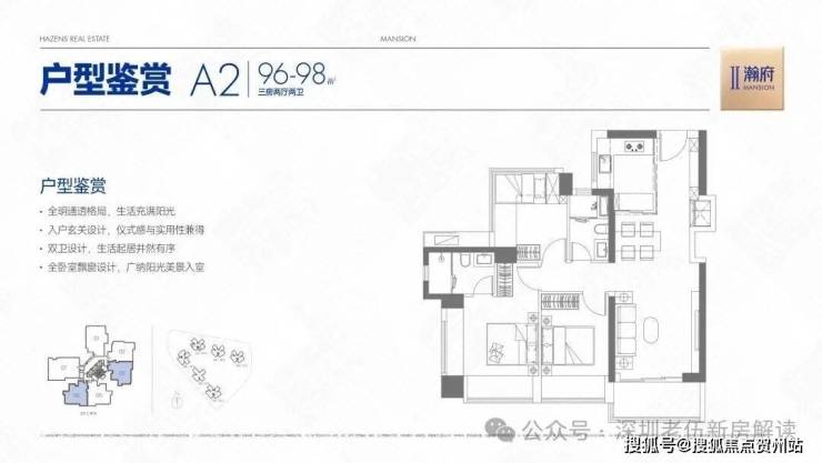 03/05/06(A2/A3)户型,竖厅三开间朝南格局,客厅3.5米开间,LDKB一体化,S墙设计预留冰箱卡槽位,主卧+1个次卧双飘窗。得房率约78%(不含赠送)。