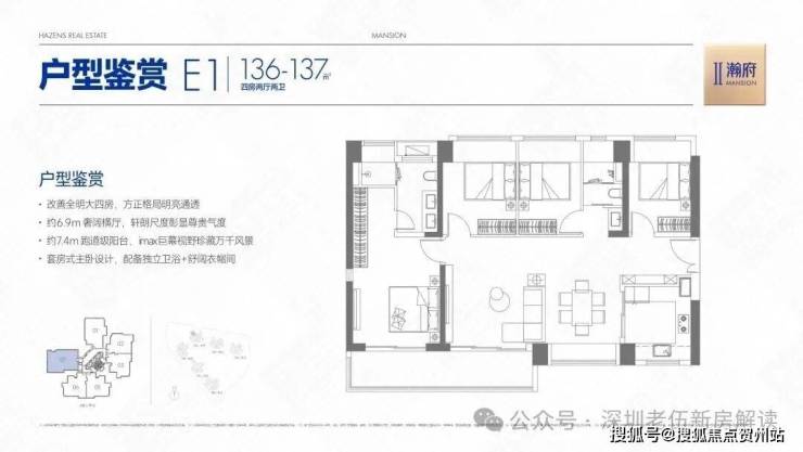 07(E1)户型,横厅朝西南,客餐厅开间6.9米开间,LDKB一体化设计,四开间朝南,全屋7面飘窗,主卧套房+步入式衣帽间,3个次卧朝东北向,客厅连接次卧出7.4米长的超大阳台。得房率约78%(不含赠送)。
