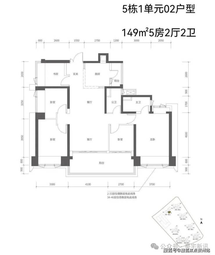 【五栋一单元-平面图】3梯3户,3条腿,分别是01、03号房户型约173㎡的5房2厅2卫、02号房户型约149㎡的5房2厅2卫