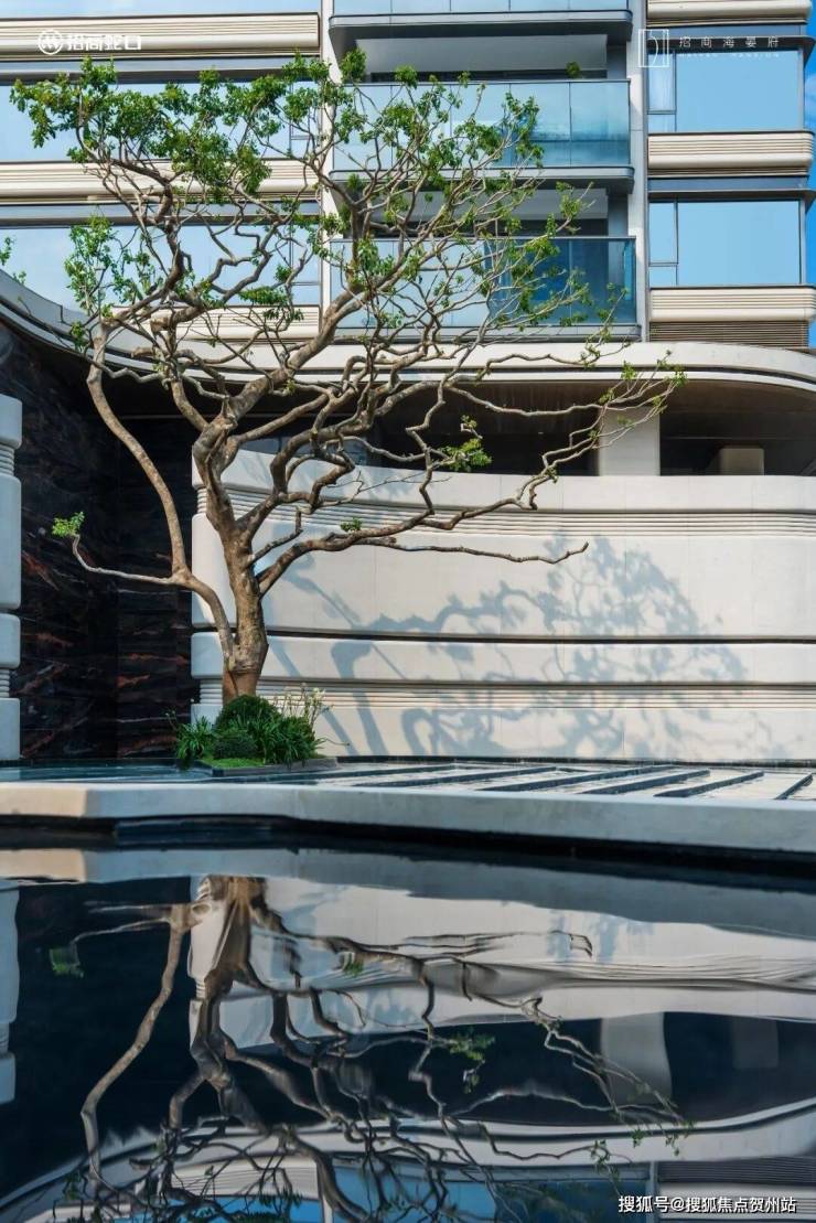 步入实景展示区,从那以海洋弧线为灵感,以名贵石材为基底的社区入口开始,搭配名树与水 景,隐奢质感便扑面而来。其中更是栽种了一株 树龄已有百年的铁冬青 ,树宅相守,寓意 家族繁盛、基业长青 。