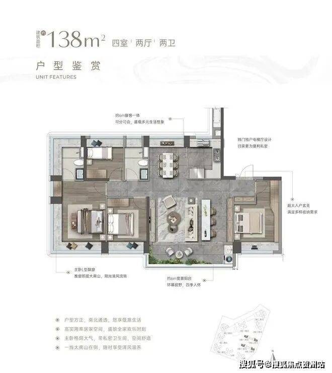 138㎡楼王户型:打造6.8米宽厅+双套房格局,客厅连接约7.2米景观阳台,实现山海景观最大化导入。主卧采用270°转角飘窗,配备独立衣帽间与明卫,打造酒店式居住体验。采用2梯2户专梯入户设计,私密性与尊崇感并存。